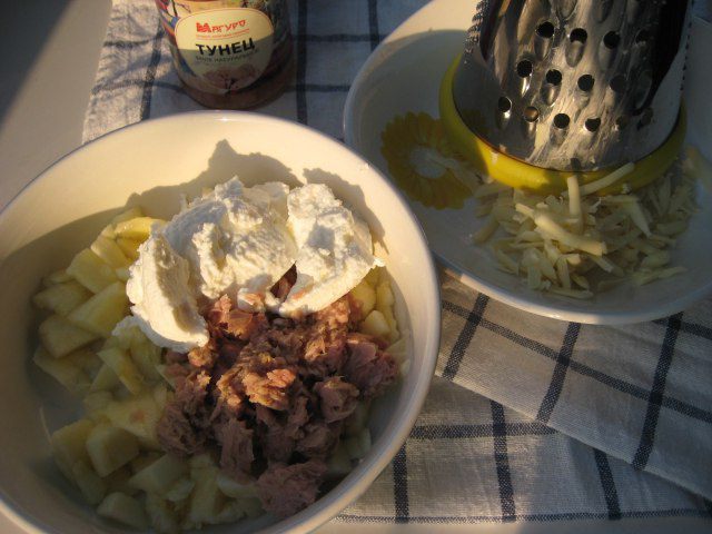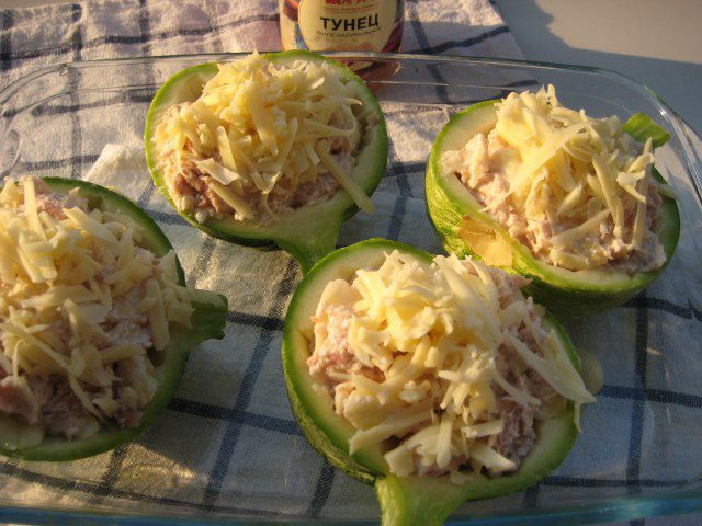 Начинка: твердый сыр натереть на терке. Филе тунца размять вилкой. Мякоть кабачков нарезать небольшими кубиками, добавить мягкий творог, филе тунца. Половину сыра добавить в начинку, посолить, поперчить, добавить листики тимьяна.