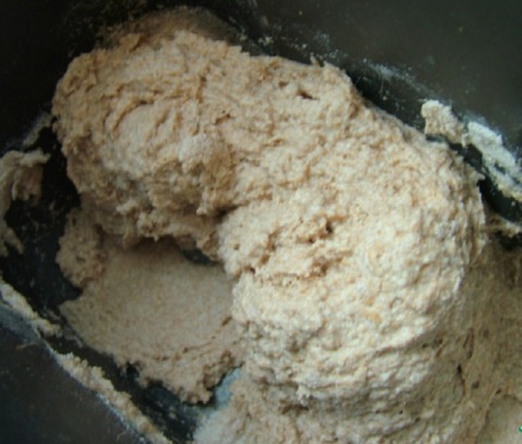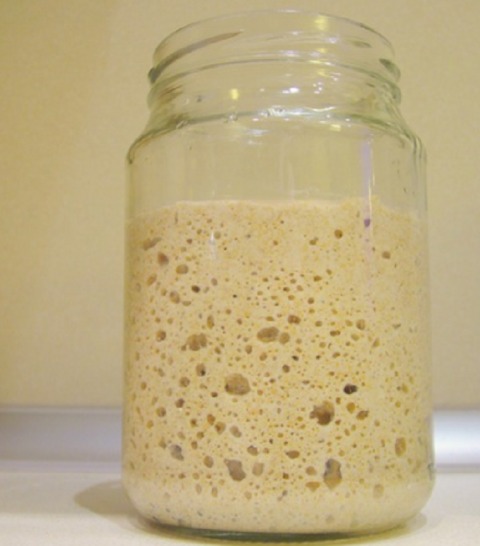 В одной порции пшеничной закваски около 50 грамм, это нужное количество для приготовления закваски используемой цельнозерновую муку. Для приготовления такой опары, добавляем в готовую пшеничную закваску 50 грамм теплой воды и такое же количество цельнозерновой муки и даем настояться и подняться.